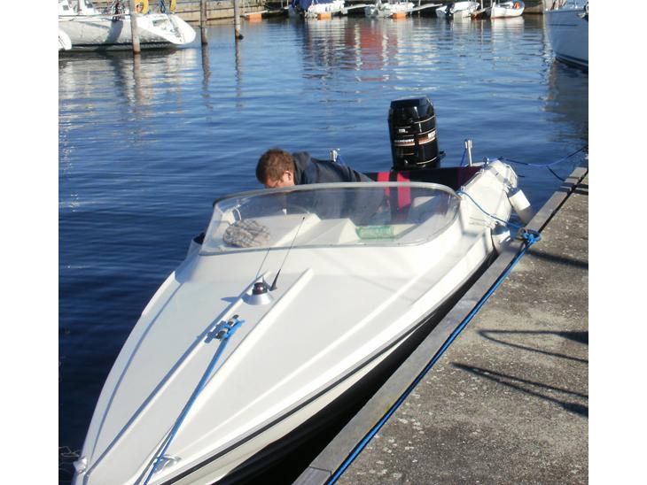 Og den er ideel til isætning på lavt vand da den ikke vejer meget. Med motor og udstyr og ca 30L bensin vejer den omkring 435kg. Og da den står på en 750kg trailer er der jo plads til en del oppakning i den når man skal på camping.