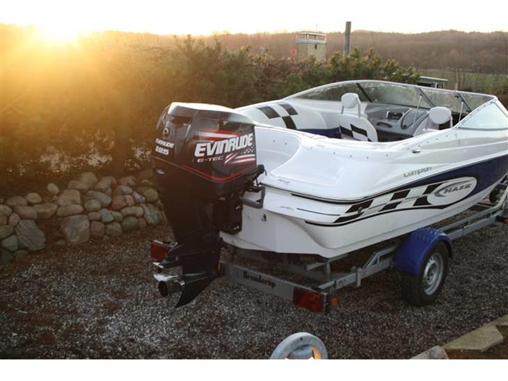 Det er en 225 hk, stafferingerne er købt som ekstraudstyr så desværre ikke en HO. Har sejlet 110km/t i svinet med 3 personer og fuld tank , den sku ku gå 120 men har ikke prøvet endnu, det er for koldt. Der er en Viper prop på men der blir indkøbt en Raker, nogen der har nogen erfaringer med denne??????.