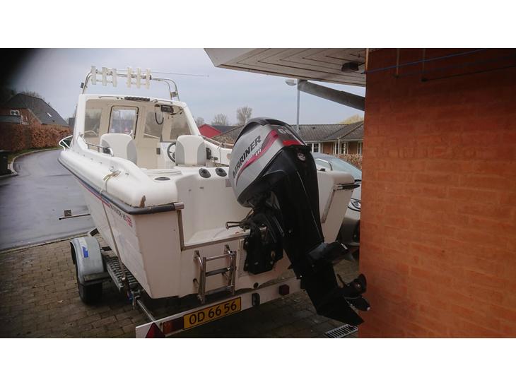 Båden er forsynet med 60 hp Mariner four stroke, som løbende er serviceret senest den 16.4.2026, Båden er også i fin stand. Det meste af tiden har den stået under tag og er vasket efter hver tur, ligesom motoren er gennemskyllet efter hver tur. Motoren har sejlet 461 timer.